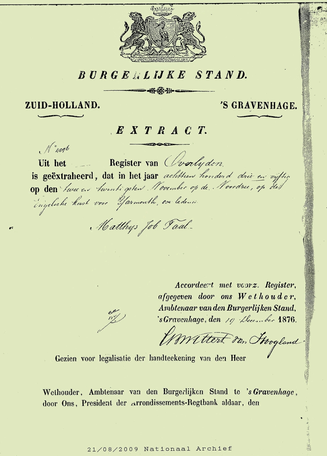 Ter hoogte van Yarmouth nabij de Engelse kust verdronk matroos Matthijs Job Taal.