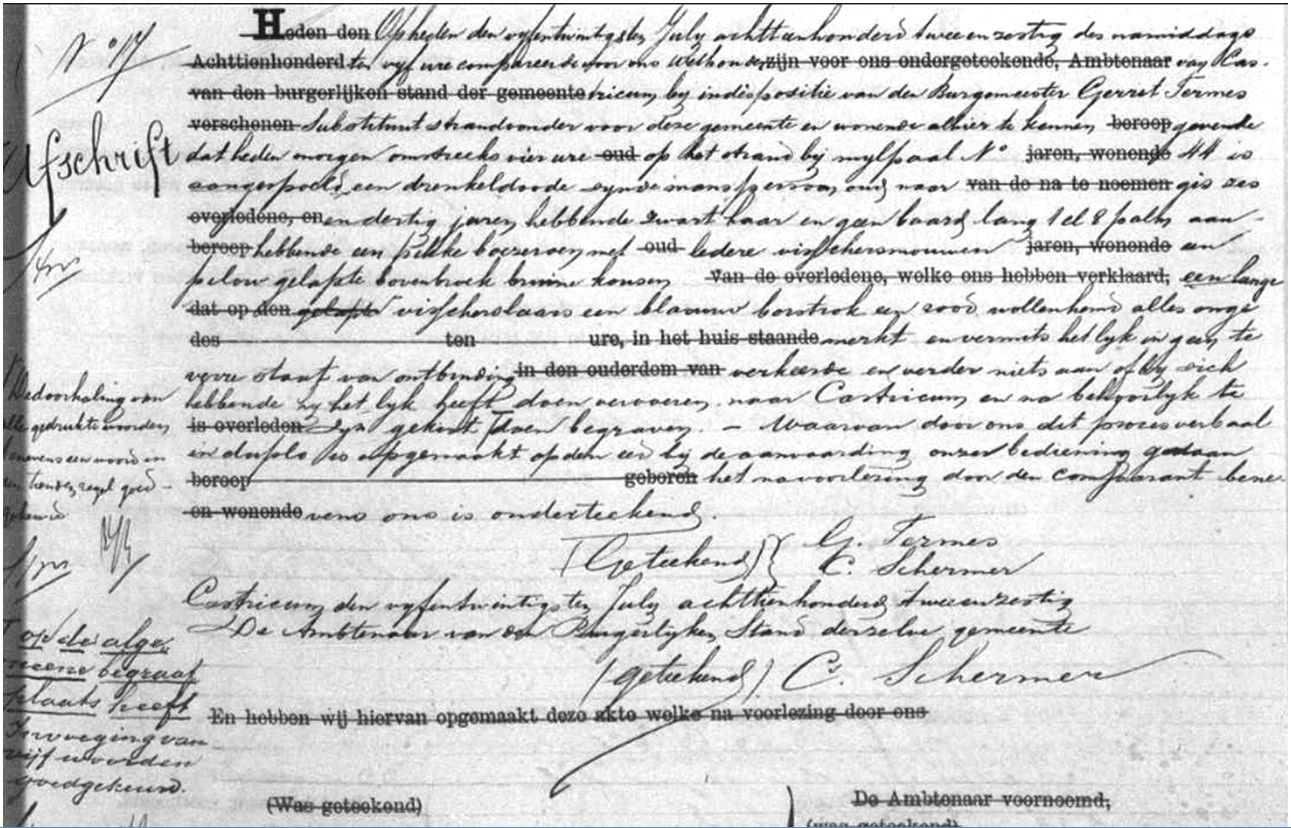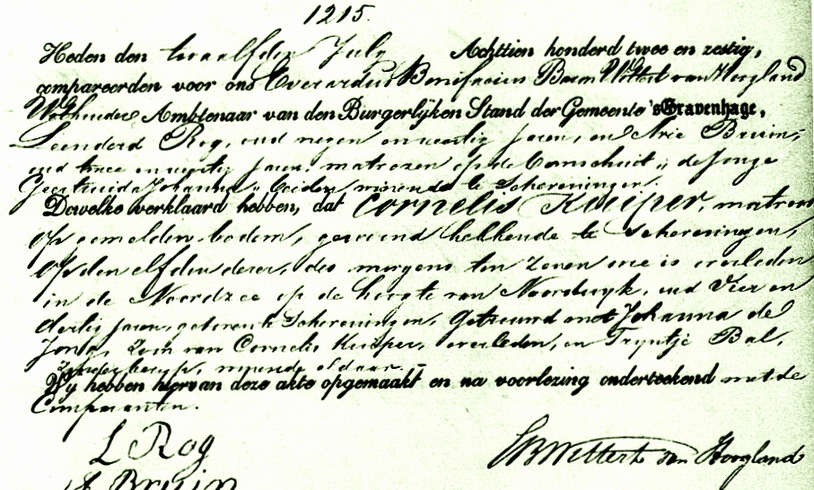 Van matroos Cornelis Kuiper was er slechts de vermelding dat hij van de visserspink, ter hoogte van Noordwijk, overboord was geslagen en verdronken. Het lichaam spoelde op de 25e juli bij het strand van Castricum aan.