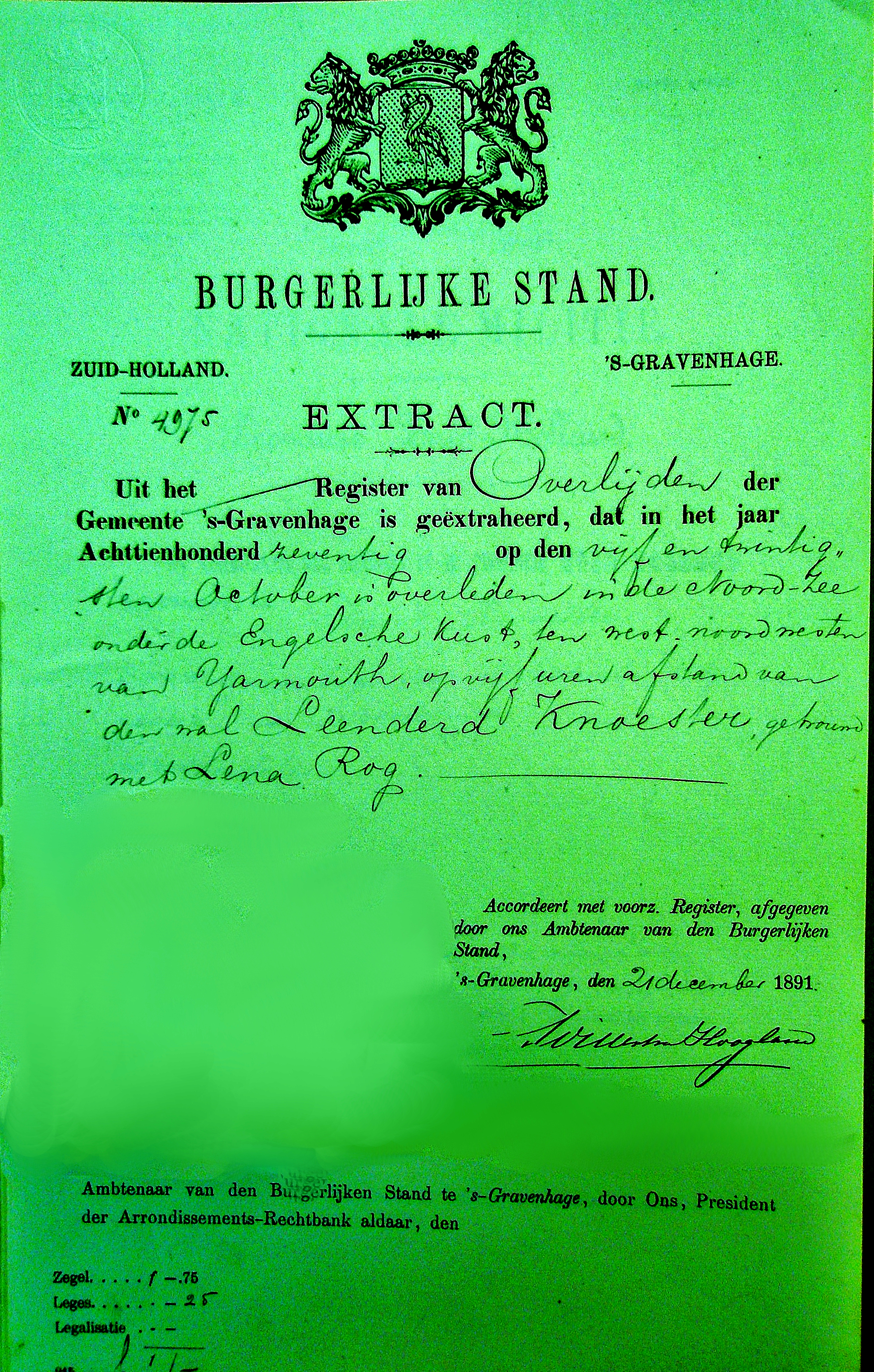 Op de pink van reder en stuurman Gerrit Zier Jol was men juist bezig onder de Engelse wal te vleet in te halen toen er een stortzee over kwam. Matroos Leenderd Knoester, die naast het spil stond werd door de klap overboord geslagen. De bemanning liet alles uit de handen vallen en snelde toe. Een spaak van het spil werd hem toegestoken maar dat bleek niet de oplossing waarna hem enkele touwwerken werden toegegooid waarvan Knoester er één kon grijpen. Toen hij met behulp van het touw tot tegen het schip aan werd getrokken kon zijn eigen broer hem bij de kleren vatten om de drenkeling om boord te hijsen. Echter het korsjak van Leendert scheurde waarna hij alsnog in de diepte zonk. Leenderd Knoester liet een weduwe en vier kinderen na. Bovendien was één van zijn andere broers in augustus op de pink De Jonge Maria omgekomen aldus het krantenbericht van destijds.