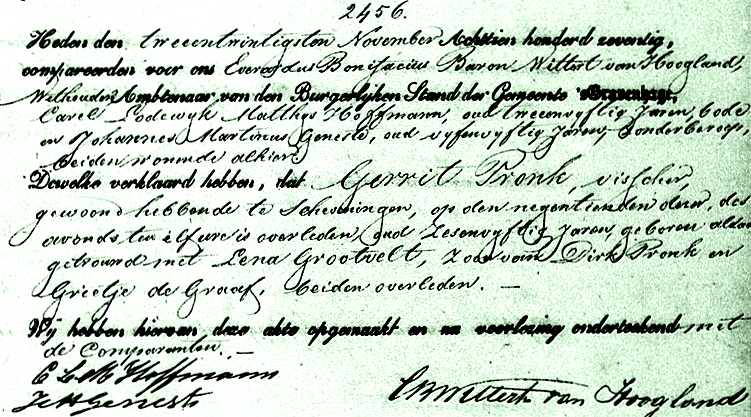 Naar verluidt –volgens het Gemeentelijk Verslag van 1870- was matroos Gerrit Pronk aan boord door een ernstige ziekte getroffen en daaraan overleden. Het lichaam werd aan wal gebracht. Zijn vader Dirk Pronk kwam op 3 maart 1820 om op een onbekend gebleven pink.