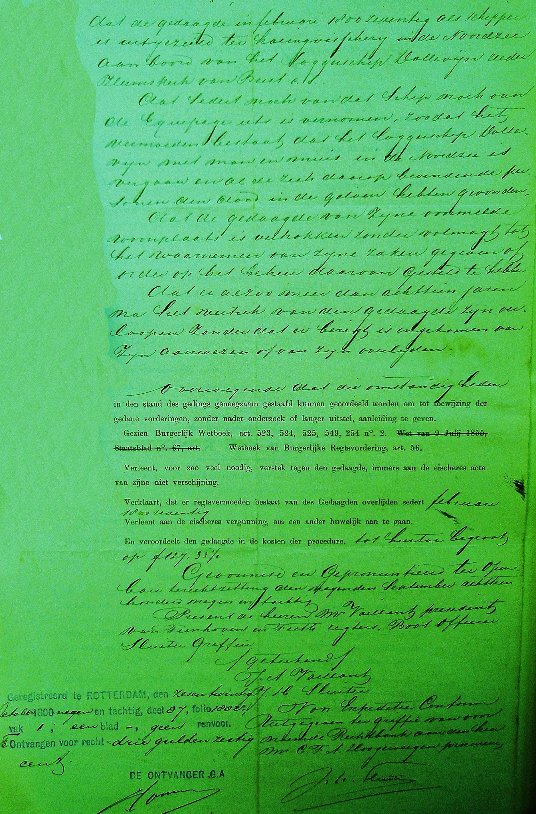 Tijdens de storm van 21/22 februari is de zeillogger 'Dolphijn' van de 'Haagsche Zeevischmaatschappij Regt door Zee' op de Grote Visschersbank voor Texel vergaan. Twaalf vissers kwamen daarbij om. De schipper en twee matrozen kwamen van Scheveningen. Zij lieten drie weduwen en zeventien wezen achter. De overige vissers kwamen van Vlaardingen en zijn onbekend gebleven.