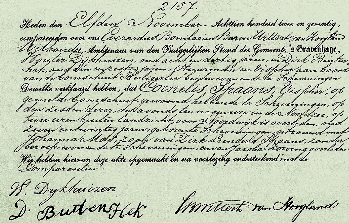De bomschuit die op 7 november terugkeerde van de haringvisserij bracht de tijding mee dat een dag tevoren - toen zij tussen Zandvoort en Noordwijk een stortzee overkregen - Cornelis Spaans overboord sloeg en vrijwel onmiddellijk in de diepte verdween.