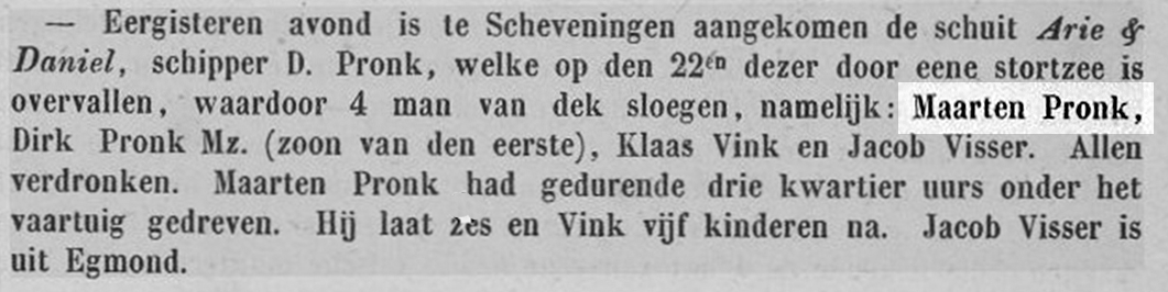 * Maarten Pronk: zijn lichaam werd gevonden en geconserveerd in zout naar Scheveningen gebracht. Zijn vader Dirk verdronk in 1860 op de ‘Vrouw Engeltje’.