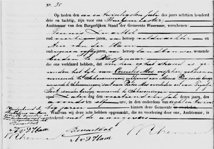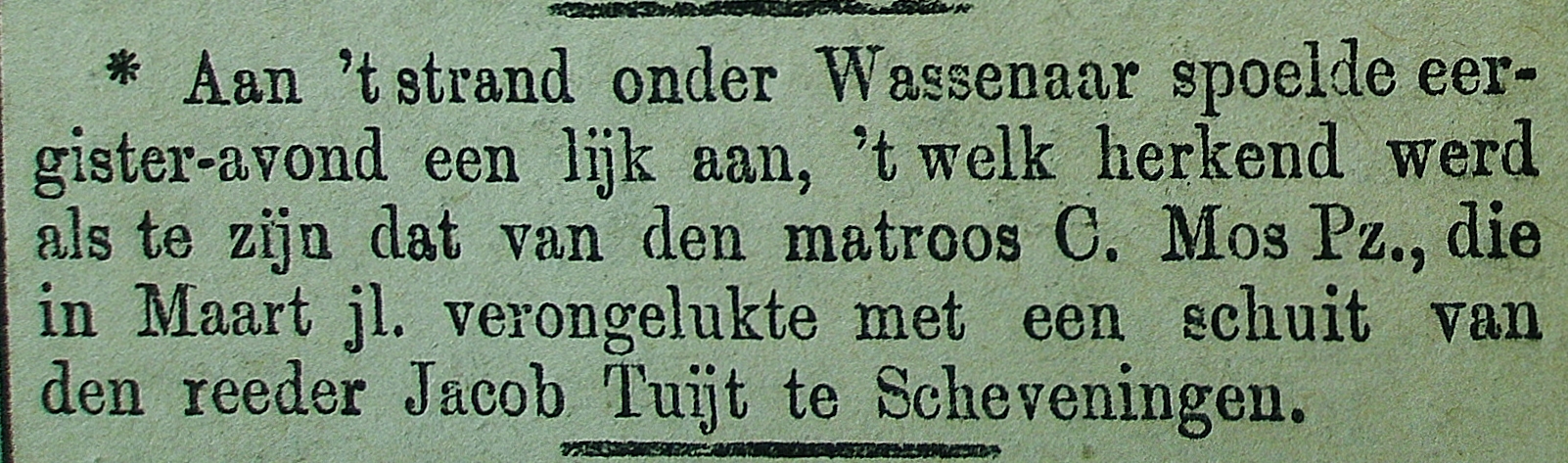* Cornelis Mos: Op 14 juli spoelde op het strand onder Wassenaar het lichaam aan. Op de 16e juli begaven de nabestaanden van de zwaar getroffen familie Mos zich naar Wassenaar. Bijgestaan door de oud-weesvader A. Vrolijk werd het lichaam aldaar ter aarde besteld.