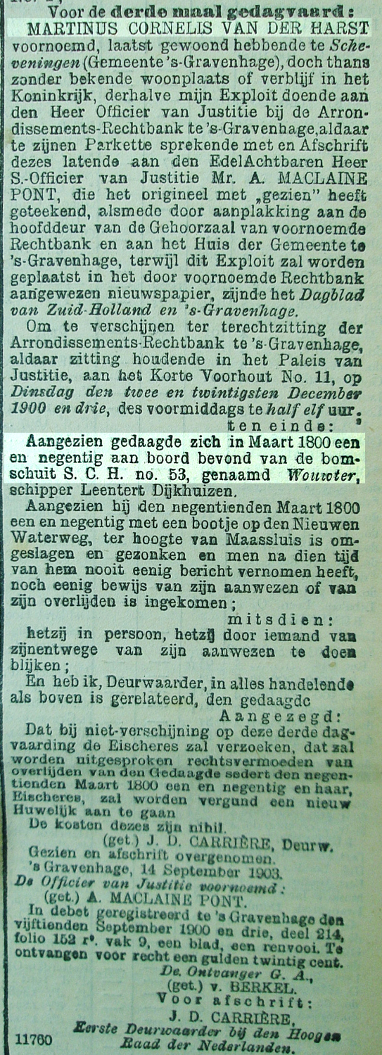 Op de Rotterdamse Waterweg hadden twee Scheveningse bomschuiten een veilige ankerplaats opgezocht in afwachting van beter weer buitengaats. Blijkbaar hadden zij hun schuiten niet aan elkaar vastgemaakt want de reddingsloep van de ‘Wouter’ moest er aan te pas komen om hun verderop gelegen collega’s een bezoek te brengen. Vier vissers roeiden vervolgens over de snelstromende Waterweg. Echter daarbij sloeg de sloep om en alle vier raakten te water. Drie mannen konden nog door een passerende stoomboot uit het water worden gehaald. Martinus Cornelis van der Harst kon niet meer worden gered.