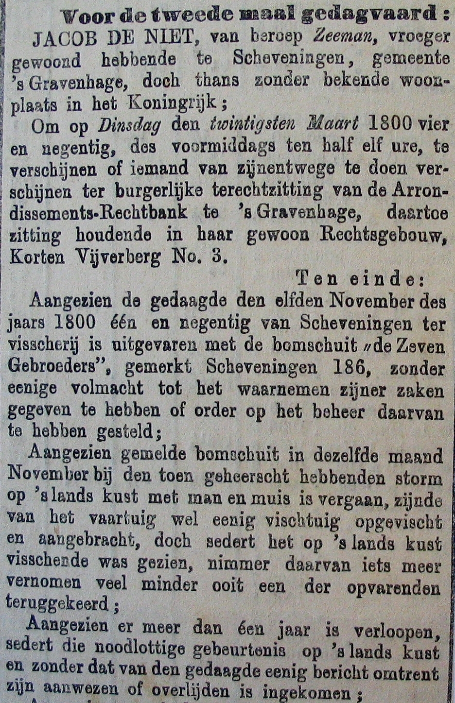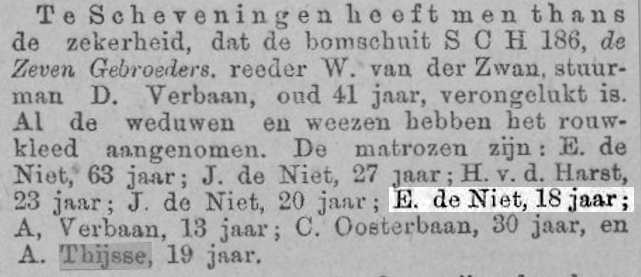 In de tweede week van december waren de meeste schuiten van de haringvisserij teruggekeerd. Echter geen van de aangekomen schuiten hadden, sinds een storm die op 11 november had gewoed, iets van de ‘Zeven Gebroeders’ vernomen of gezien. Wel was er een bomschuit ondersteboven drijvende gezien maar er waren geen merktekens zichtbaar zodat het evengoed de Katwijker bomschuit KW 67 kon zijn die in die dagen eveneens werd vermist. Echter nadat rond 8 december de 'rijer' en enkele netten van de SCH 186 te Scheveningen waren aangebracht werd dan ook duidelijk dat het schip met rijer en al van zijn vleet was ‘afgegooid’ en met 9 vissers ten onder gegaan.