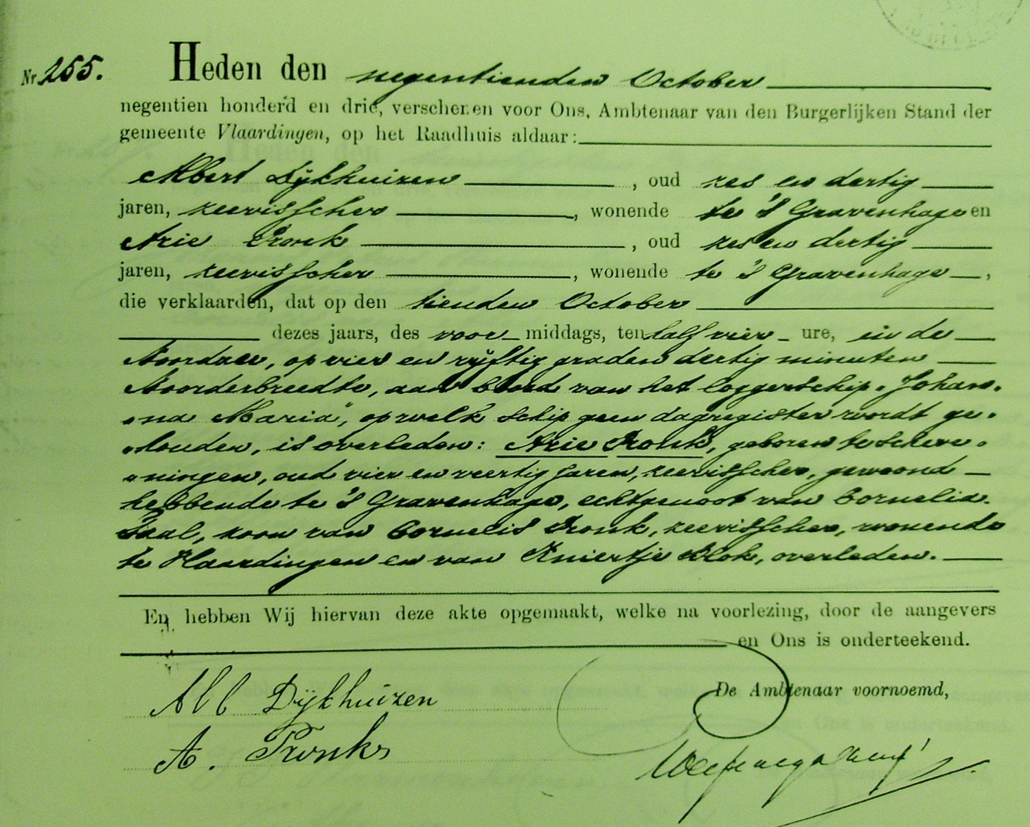 Tijdens slecht weer moest de bomschuit met een handpomp worden lens gehouden. Matroos Arie Pronk die daar mee bezig was kreeg een slag water, sloeg overboord en was niet meer te redden. Hij liet een zwangere vrouw en zes kinderen na.