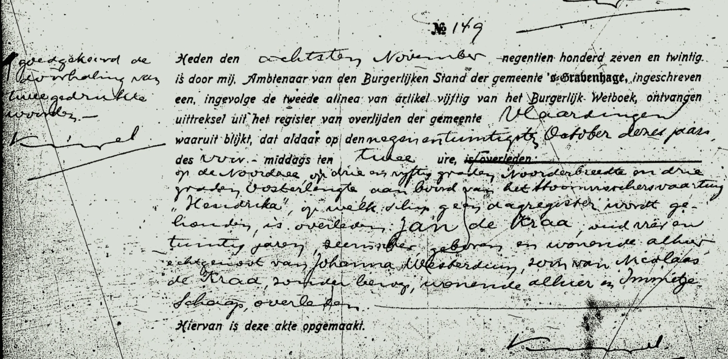 Matroos Jan de Kraa sloeg tijdens stormweer overboord en werd niet meer gevonden.