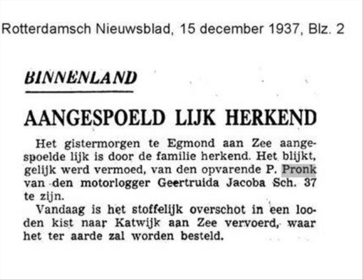 Tijdens het innemen van het gatzeil, circa twee mijlen van IJmuiden, viel matroos Pieter Pronk vanaf de sloep eerst op de verschansing en vervolgens, bewusteloos of al overleden, overboord en verdronk. Het lichaam spoelde op 14 december, twee kilometer ten noorden van Egmond a/zee, op het strand aan. Het lichaam werd naar Katwijk a/zee vervoerd alwaar hij werd begraven.