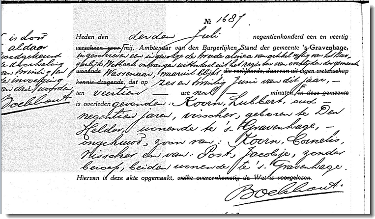 De uit Den Helder afkomstige familie Koorn was aan het begin van de Tweede Wereldoorlog naar Scheveningen gekomen. Woonachtig in de Doornstraat deden zij vanuit Scheveningen aan de kustvisserij. Met de houten motorblazer krijgen zij een torpedo in het net die langszij van het schip ontploftte. De broers Dirk- en Lubbert Koorn komen hierbij om het leven. Het lichaam van Lubbert spoelde op 26 juni op het strand van de Wassenaarse Slag aan. Dirk spoelde op 28 juni tussen Kijkduin en Scheveningen aan. Beide werden begraven op de Algemene Begraafplaats van Huisduinen.