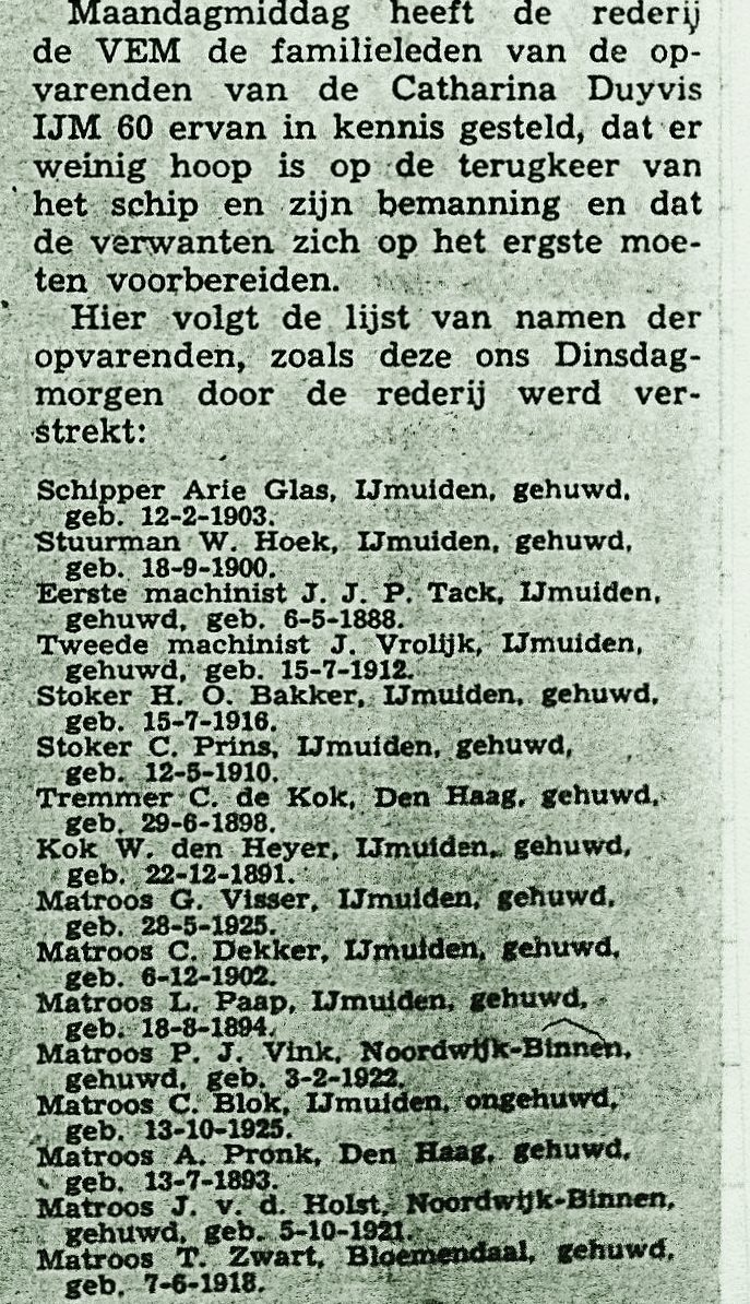 * Een maand na de ramp werd met de kotter HD 14 'Twee Gebroeders' op 35 mijl ten NW van IJmuiden het lichaam van matroos Visser opgevist.