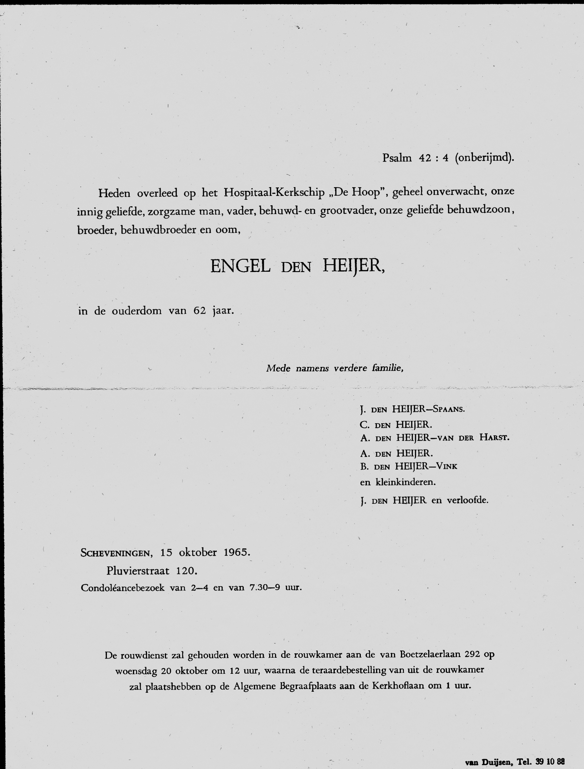 Het was in 1e instantie niet aan te tonen of dat Engel den Heijer visser op de vloot was of dat hij tot de bemanning van het HKS 'De Hoop' behoorde. Genoemde P.Grootveld was echter in 1965 matroos op 'De Hoop'. Grootveld bevestige dat Engel den Heijer wel visser op de vloot was en na een opname op 'De Hoop' dood in de kooi werd aangetroffen.