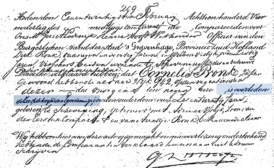 Van de visser Cornelis Pronk slechts de aangifte dat hij op zee ter hoogte van Egmond a/zee overleed. De aangifte werd gedaan door zijn vader Dirk Pronk en zijn schoonvader Willem Vrolijk.