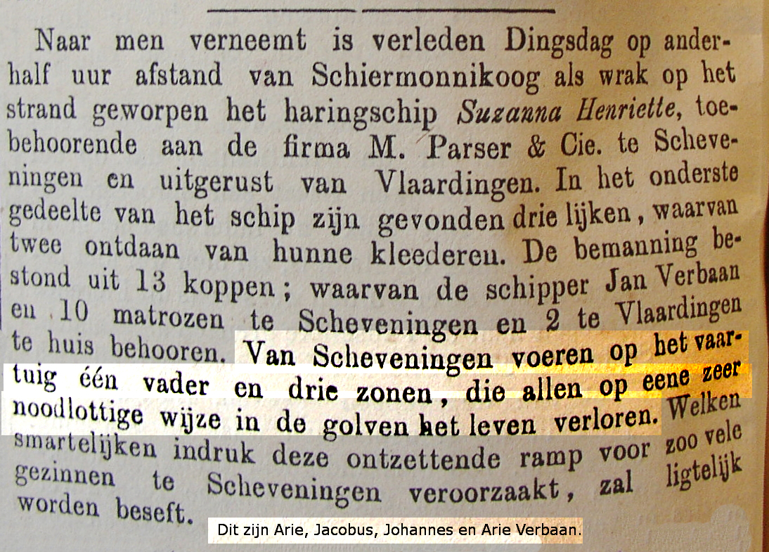 In de eerste week van oktober 1867 verging er voor de eerste maal een loggerschip. Het scheepstype zelf was in 1866 door de Scheveningse reder A. E. Maas in de vaart gebracht. In navolging van Maas kocht, de in Scheveningen wonende, reder en koopman Marcus Parser eveneens een logger aan. In tegenstelling tot de eerste drie loggers van Maas, die drie masten hadden, had deze slechts twee masten. De logger werd op het Simonszand - een klein Waddeneiland tussen Schiermonnikoog en Rottumerplaat - geworpen. Na het bericht dat er nog drie lijken in het wrak waren aangetroffen vertrokken de reder Marcus Parser en Pieter van der Harst -opzichter der kustverlichting- naar het kleine eiland. Twee van de drie lichamen waren van hun kleren ontdaan, aldus het bericht. Toen reder Parser en zijn mannen ter plekke kwamen bevond zich nog slechts het lijk van de 64-jarige Arie Verbaan in het wrak. Maar er was meer te zien. Op het wrak was de plaatselijk bekende jutter Joap Tjerks bezig om met een bijl het touwwerk van het wrak te kappen. Om het lijk van Scheveninger Arie Verbaan bekommerde hij zich niet. Op de vraag van Parser of hij soms meer lijken had gezien werd een brutaal en onverschillig antwoord gegeven. Het werd destijds niet voor onmogelijk gehouden dat de jutter Tjerks de andere twee lijken aan de zee had teruggegeven, nadat hij ze eerder van hun kleren had ontdaan.