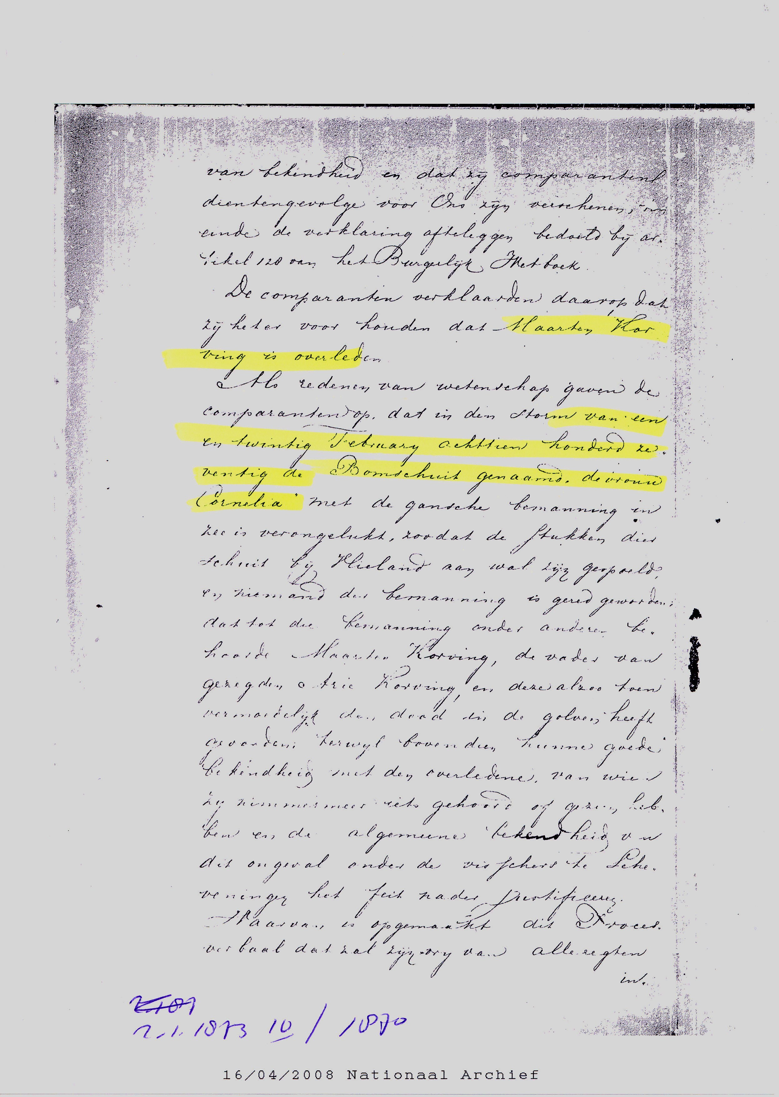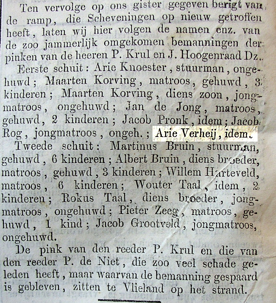 Rond 22 februari kwam er van Vlieland een telegram dat er twee Scheveningse pinken tijdens slecht weer met het aanlopen van de haven van Oost - Vlieland waren omgeslagen. De pink spoelde op het strand van Vlieland aan, maar lichamen werden er in het wrak niet meer aangetroffen.