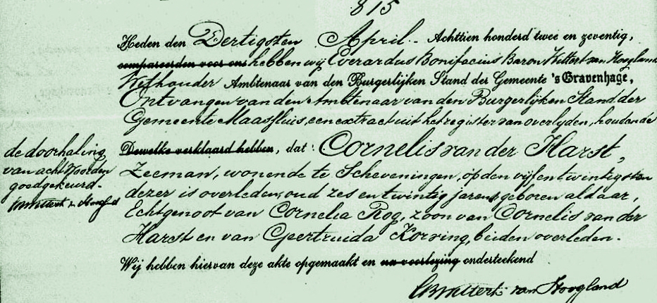 In de haven van Maassluis verdronk matroos Cornelis van der Harst. Na enkele dagen werd het lichaam opgehaald.