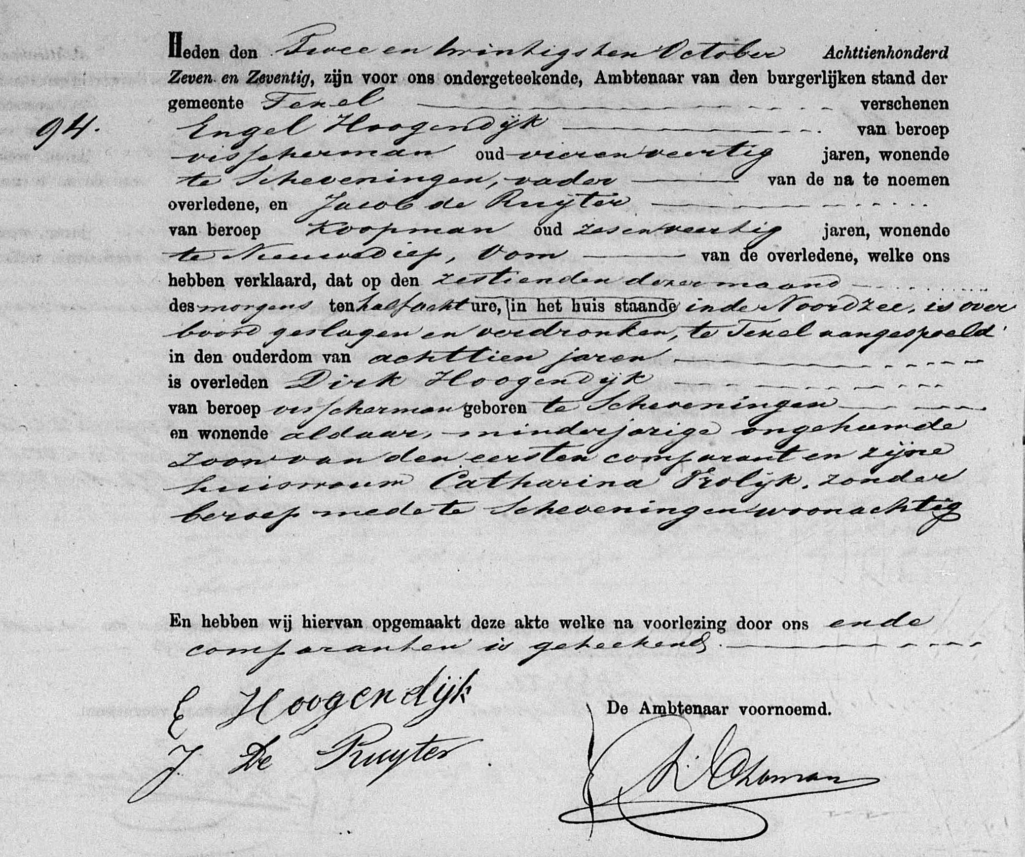 Tijdens slecht weer, voor het Kijkduin bij Nieuwendiep, kreeg de schuit een stortzee over waarbij de stuurman, twee matrozen en een jongen overboord werden geslagen. Het viertal was echter niet meer te redden.