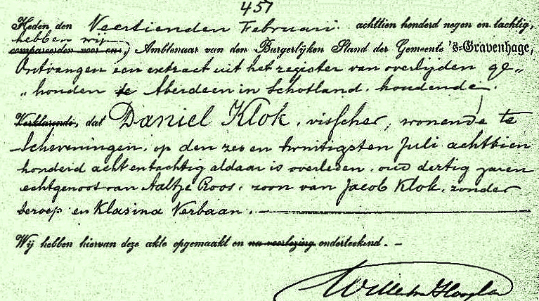 Negen dagen na zijn opname is matroos Daniël Klok in het Royal Infermary Hospital -van het Schotse Aberdeen- aan longontsteking overleden.