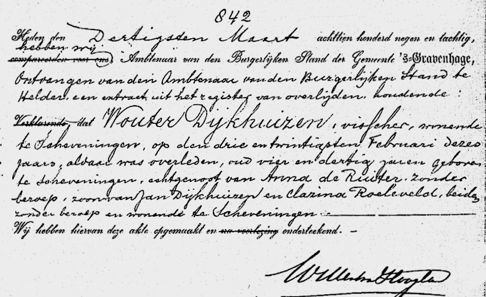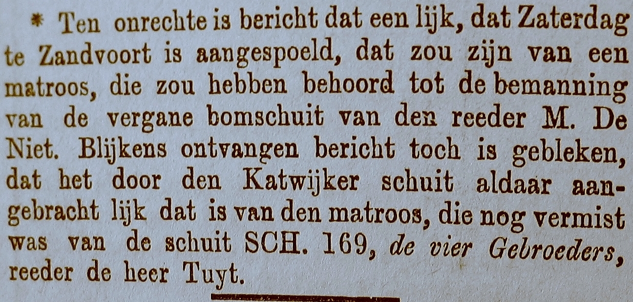 In diezelfde dagen kwam er de jobstijding. Tussen Scheveningen en Katwijk waren op het strand een halve mast, acht luiken en twee zwaarden aangespoeld. De zwaarden waren voorzien van de initialen K. D. H. De letters stonden voor Krijn Dijkhuizen, schipper van de bomschuit De Vier Gebroeders. Er was toen zekerheid dat de bomschuit tijdens de storm met zeven vissers was vergaan.