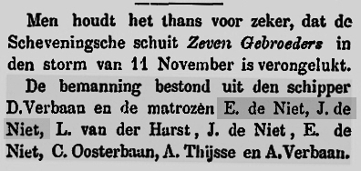 In de tweede week van december waren de meeste schuiten van de haringvisserij teruggekeerd. Echter geen van de aangekomen schuiten hadden, sinds een storm die op 11 november had gewoed, iets van de ‘Zeven Gebroeders’ vernomen of gezien. Wel was er een bomschuit ondersteboven drijvende gezien maar er waren geen merktekens zichtbaar zodat het evengoed de Katwijker bomschuit KW 67 kon zijn die in die dagen eveneens werd vermist. Echter nadat rond 8 december de 'rijer' en enkele netten van de SCH 186 te Scheveningen waren aangebracht werd dan ook duidelijk dat het schip met rijer en al van zijn vleet was ‘afgegooid’ en met 9 vissers ten onder gegaan.