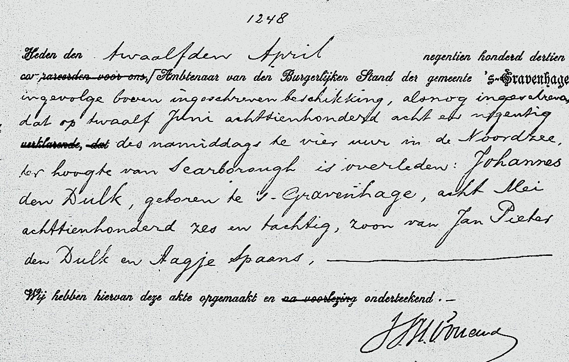 Ter hoogte van Scarborough verdronk de nog jonge Johannes den Dulk. Meer is er van het voorval niet bekend geraakt.
