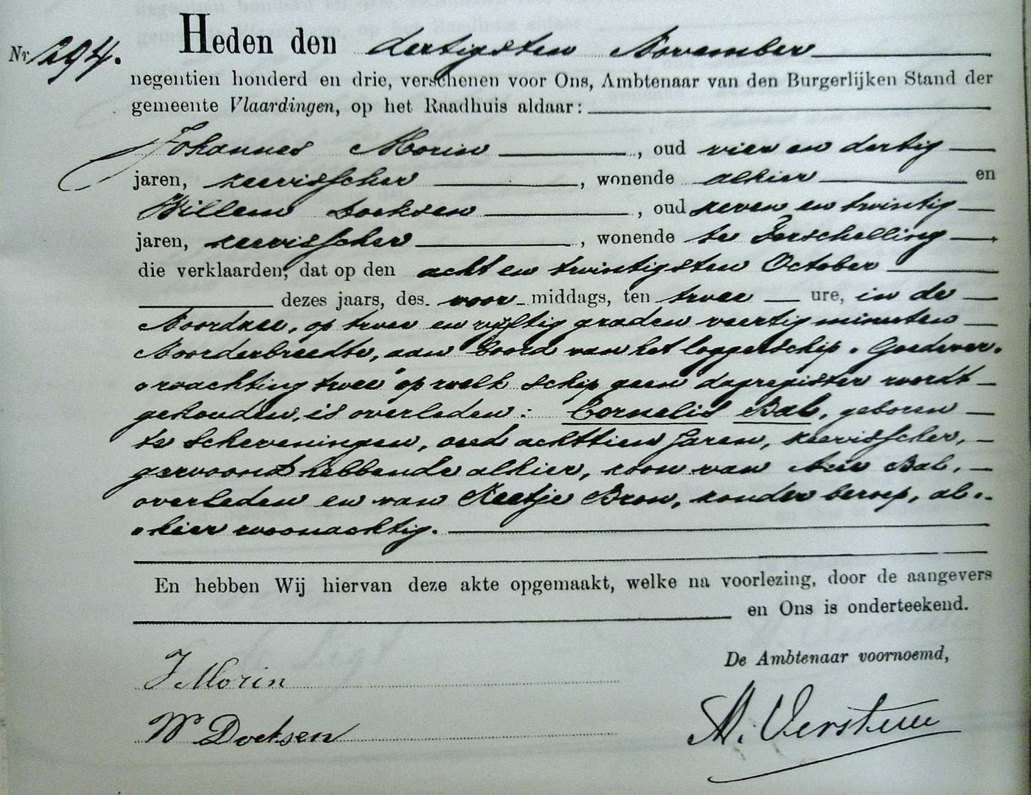 Op 30 oktober 1903 deed de schipper van de zeillogger aangifte bij de Burgerlijke Stand te Vlaardingen van het verlies van zijn matroos Cornelis Bal. Bal was op de Noordzee op 52° en 40 ' noorderbreedte overboord geraakt en verdronken. Cornelis Bal was evenals zijn ouders afkomstig van Scheveningen maar woonde tijdens het ongeluk bij zijn ouders te Vlaardingen.