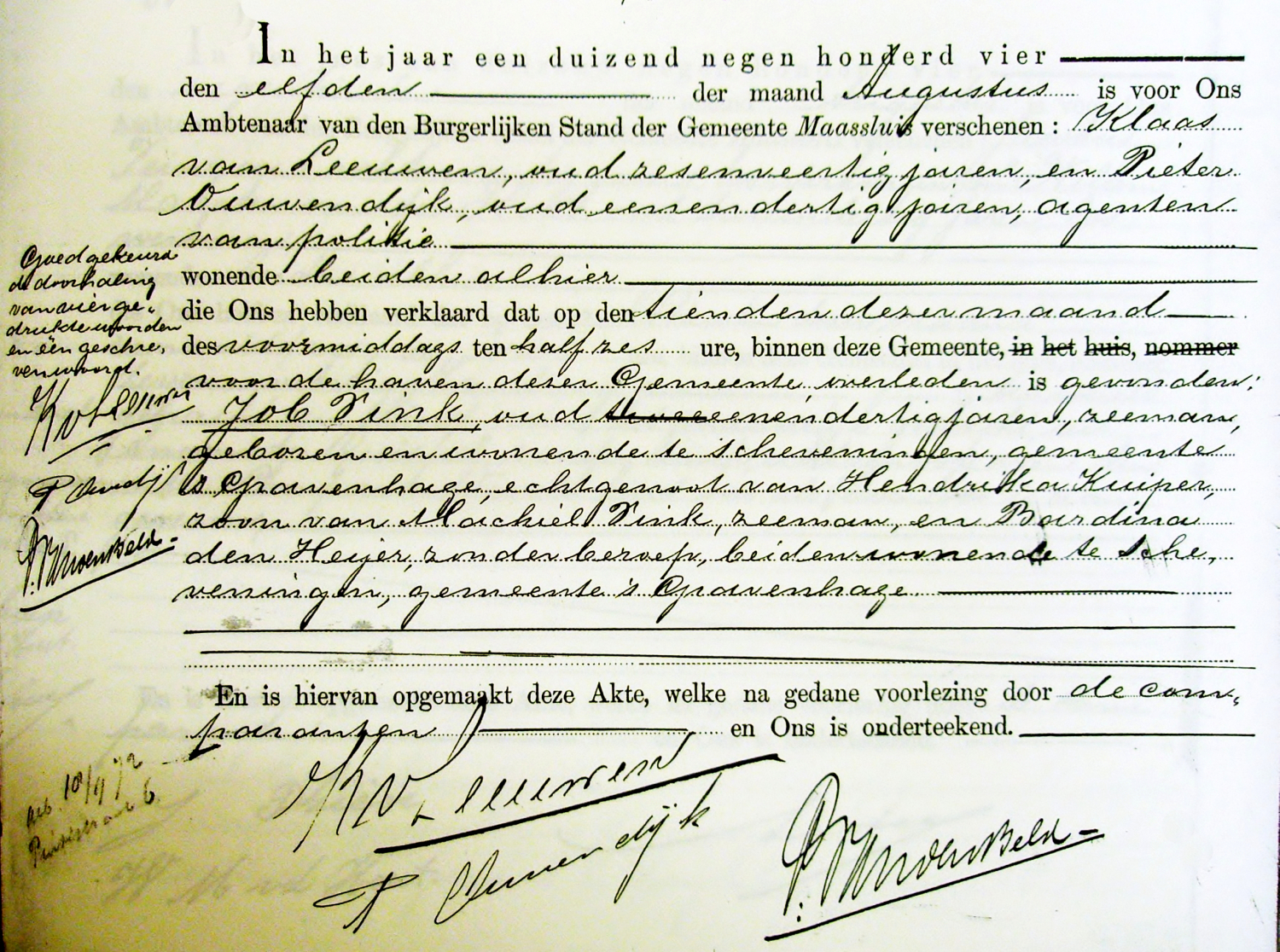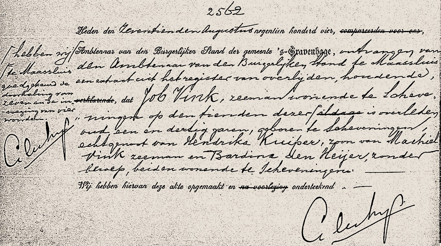 Op de Nieuwe Waterweg, tijdens het vastmaken van enig touwwerk in de achtermast van de bomschuit, kreeg matroos Job Vink een klap van het zeil waarbij hij overboord viel en daarna verdronk. Het lichaam werd later gevonden en door de familie herkend.