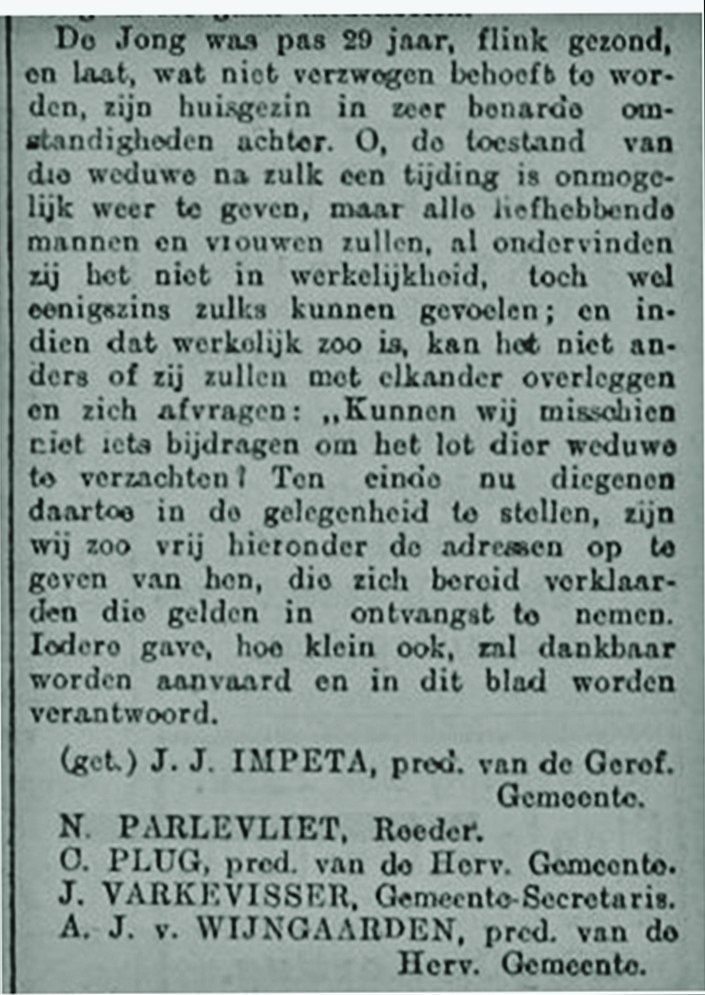 De overboord geslagen en verdronken Willem de Jong woonde te Katwijk a/zee maar is op 2 maart 1876 te Scheveningen geboren. Hij huwde op 21 december 1900 met de Katwijkse Jaboba van der Boon.