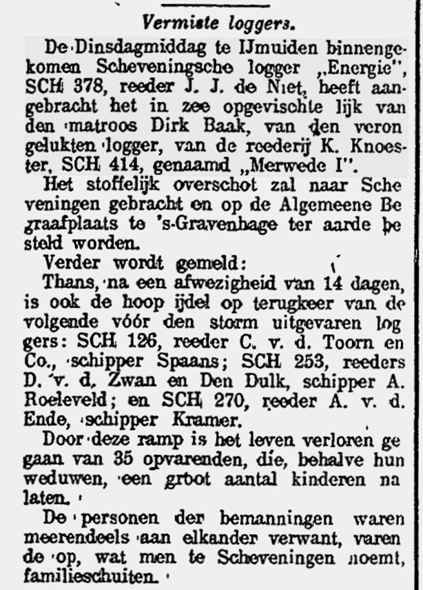 Het lichaam van Dirk Baak werd op 25 januari door de SCH 378 te IJmuiden aangebracht.