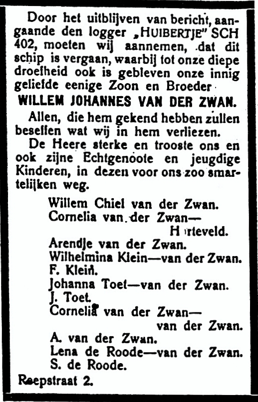 Willem Johannes van der Zwan: zijn drie zoons Johannes, Willem Chiel, en Dirk kwamen in 1941 gelijktijdig om op de SCH 33 'De Vrouw Trijntje.'