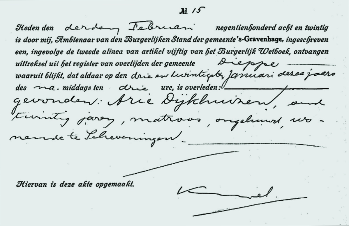 In het Franse Dieppe werd Arie Dijkhuizen vermist. Pas in januari 1928 werd zijn lichaam in de haven gevonden en met de SCH 310 op de 27e januari naar Scheveningen gebracht.