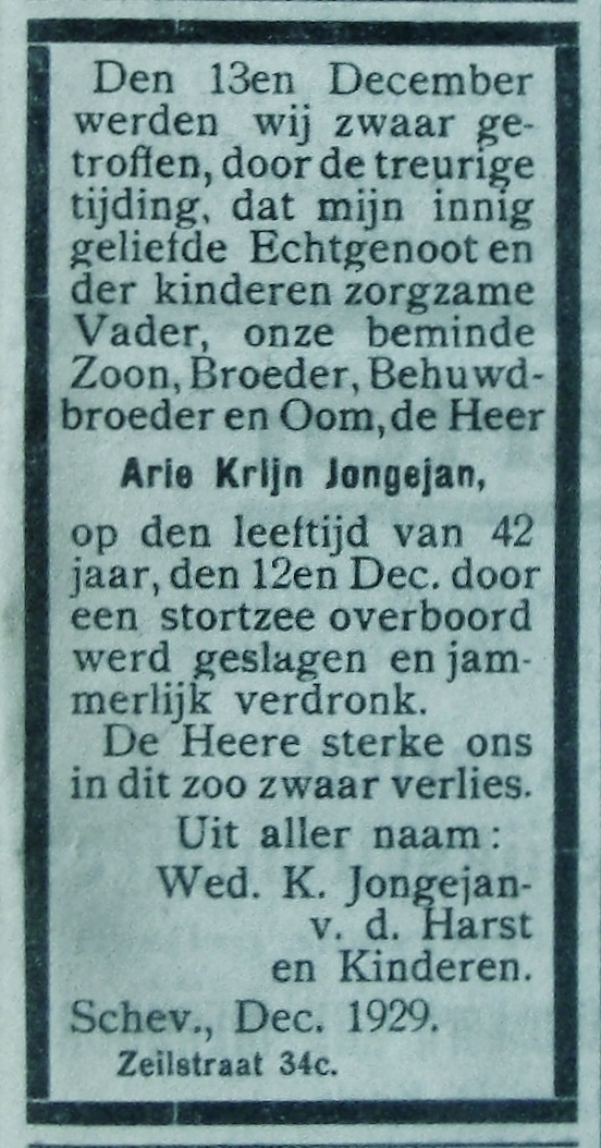 Door een stortzee sloeg Arie Krijn Jongejan overboord en werd niet meer gevonden.