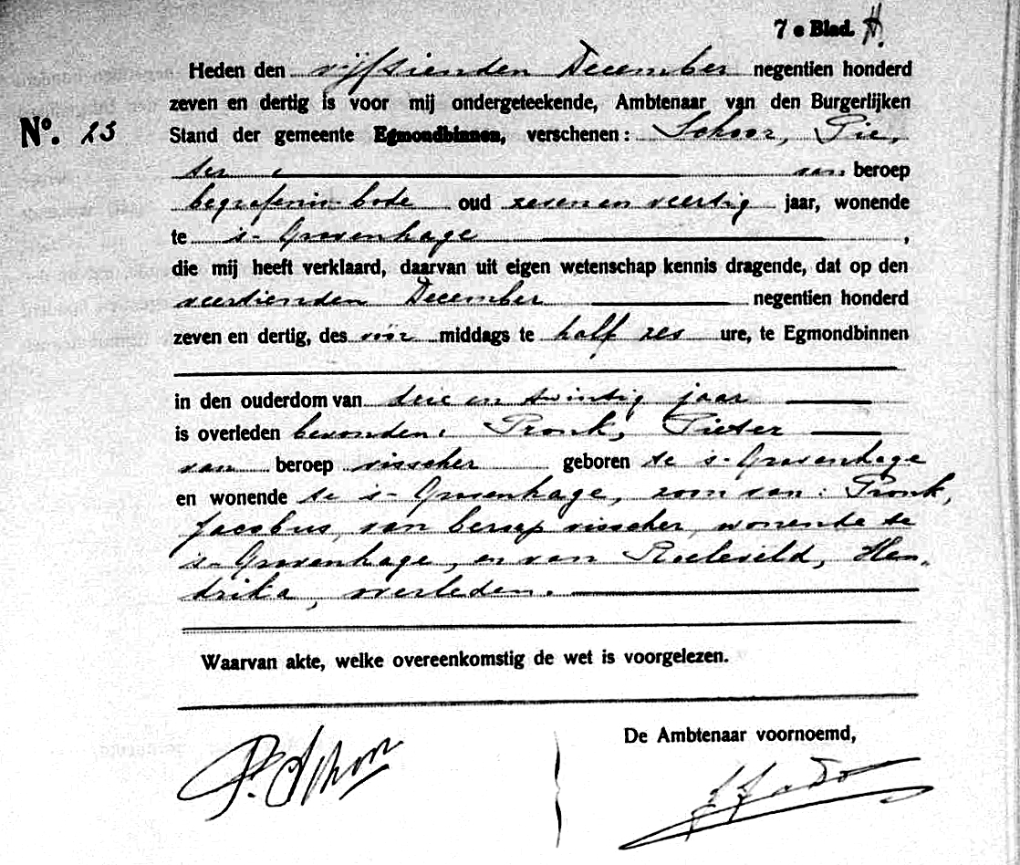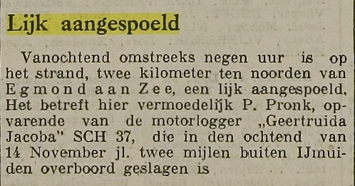 Tijdens het innemen van het gatzeil, circa twee mijlen van IJmuiden, viel matroos Pieter Pronk vanaf de sloep eerst op de verschansing en vervolgens, bewusteloos of al overleden, overboord en verdronk. Het lichaam spoelde op 14 december, twee kilometer ten noorden van Egmond a/zee, op het strand aan. Het lichaam werd naar Katwijk a/zee vervoerd alwaar hij werd begraven.