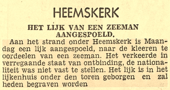 * Hendrik Roeleveld spoelde nog op dezelfde dag op het strand bij Wassenaar aan.