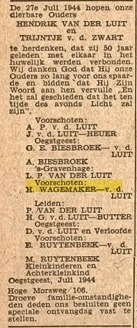 Jan Wagemaker was in 1908 geboren te Den Haag vertrok achtereenvolgens in 1930 naar Oegstgeest en in 1937 naar Katwijk a/zee. Moest in 1943 evacueren naar Voorschoten.