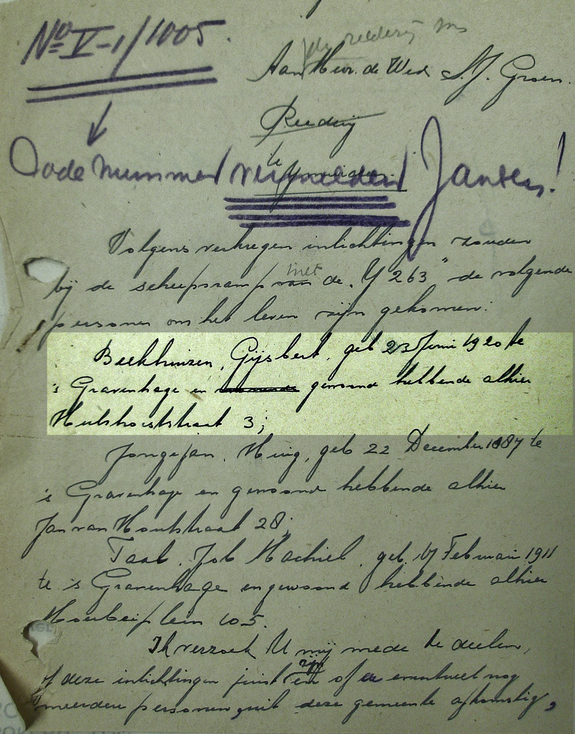 * Gijsbert Beekhuizen: zijn vader Arie- kwam in dezelfde maand om op de SCH 65 'Onderneming'.