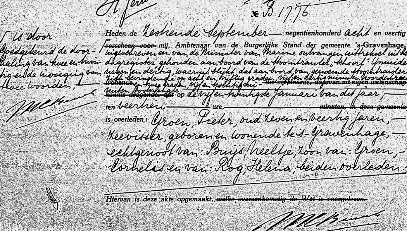 Op de noordelijke Noordzee sloeg Pieter Groen overboord en verdronk.