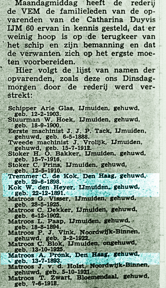 * Een maand na de ramp werd met de kotter HD 14 'Twee Gebroeders' op 35 mijl ten NW van IJmuiden het lichaam van matroos Visser opgevist.